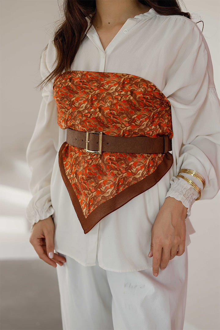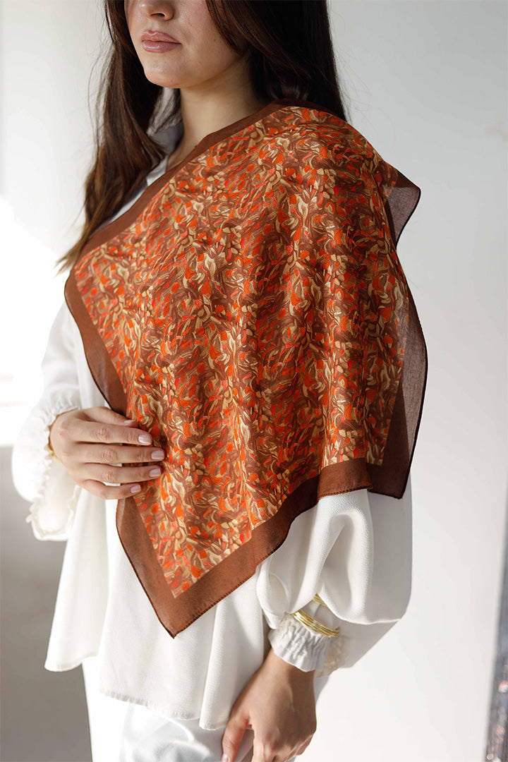 %100 Organik Pamuk Fular Yaprak Desen Kahve Turuncu