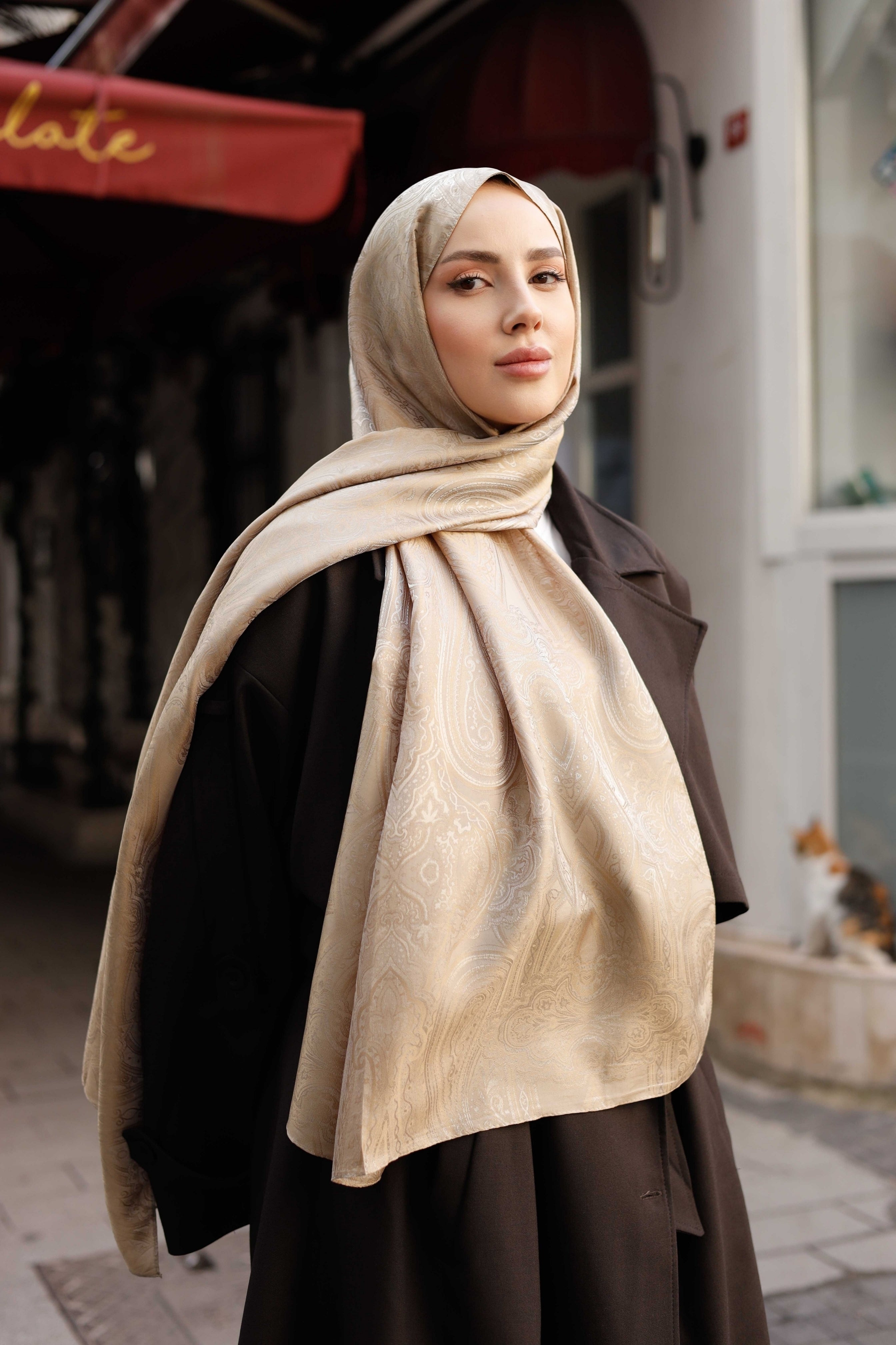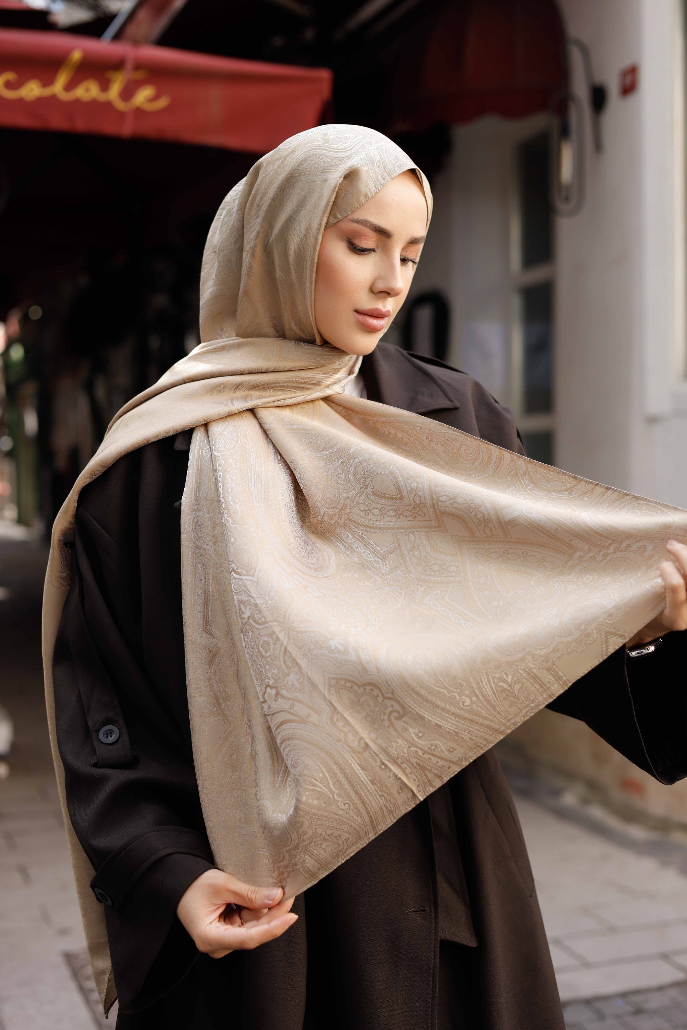 İPEKSİ ÇİFT TARAFLI JAKAR ŞAL - HİNT DESEN - SÜTLÜ KAHVE