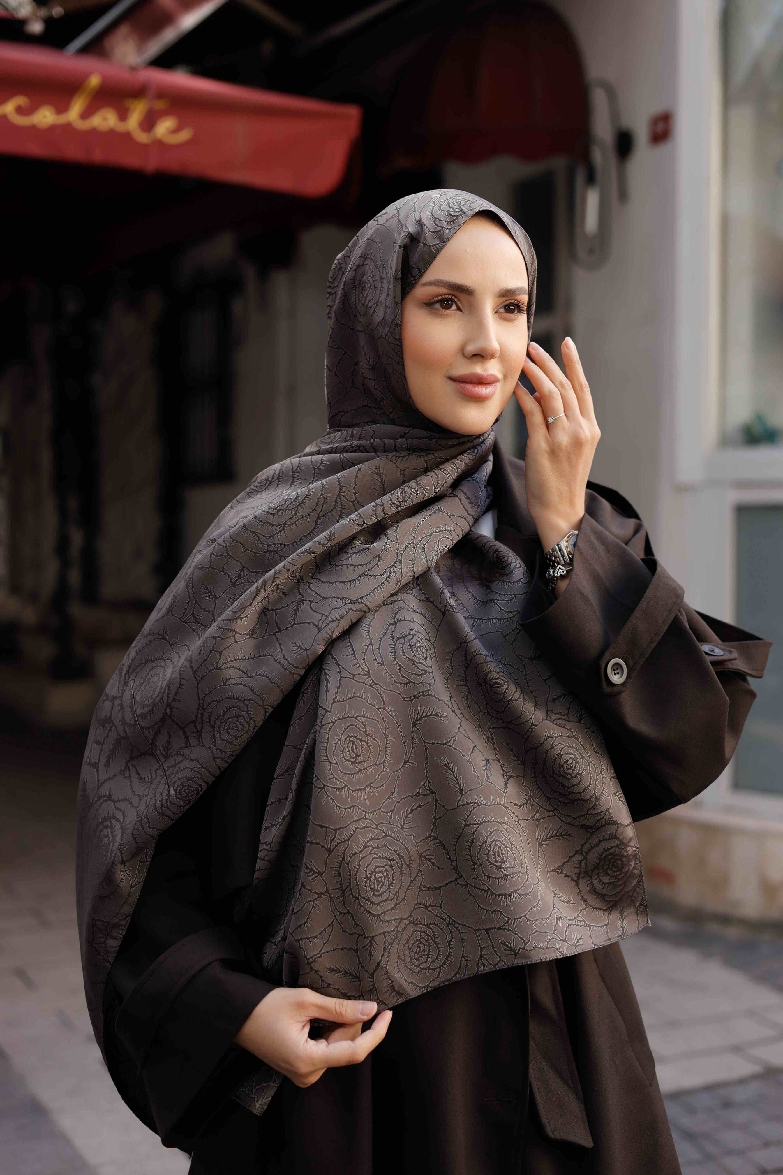 İpeksi Çift Taraflı Jakar Şal Rose Koyu Füme