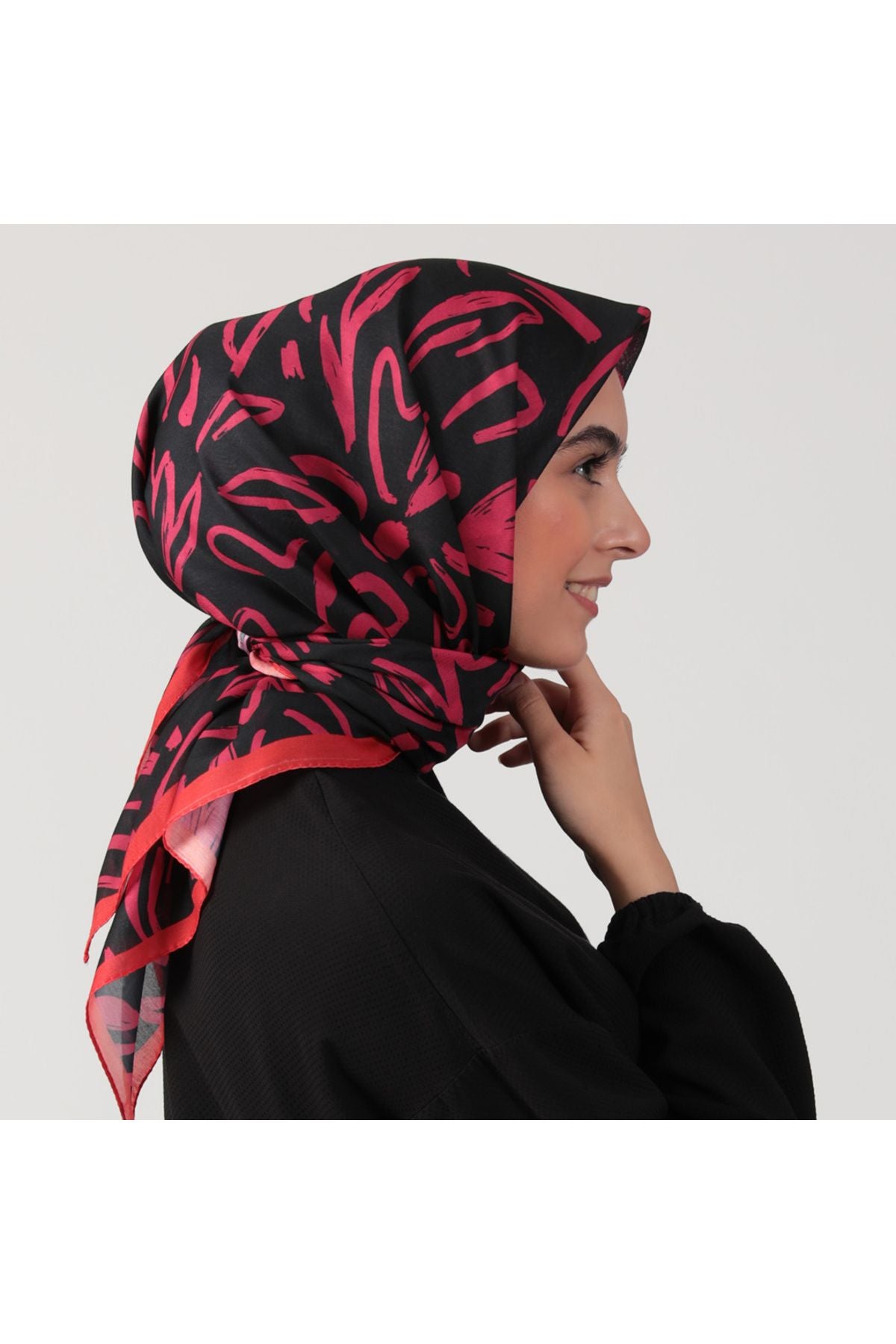 • Pamuk İpek Eşarp - Akşam Sefası Desen - Siyah Fuşya
