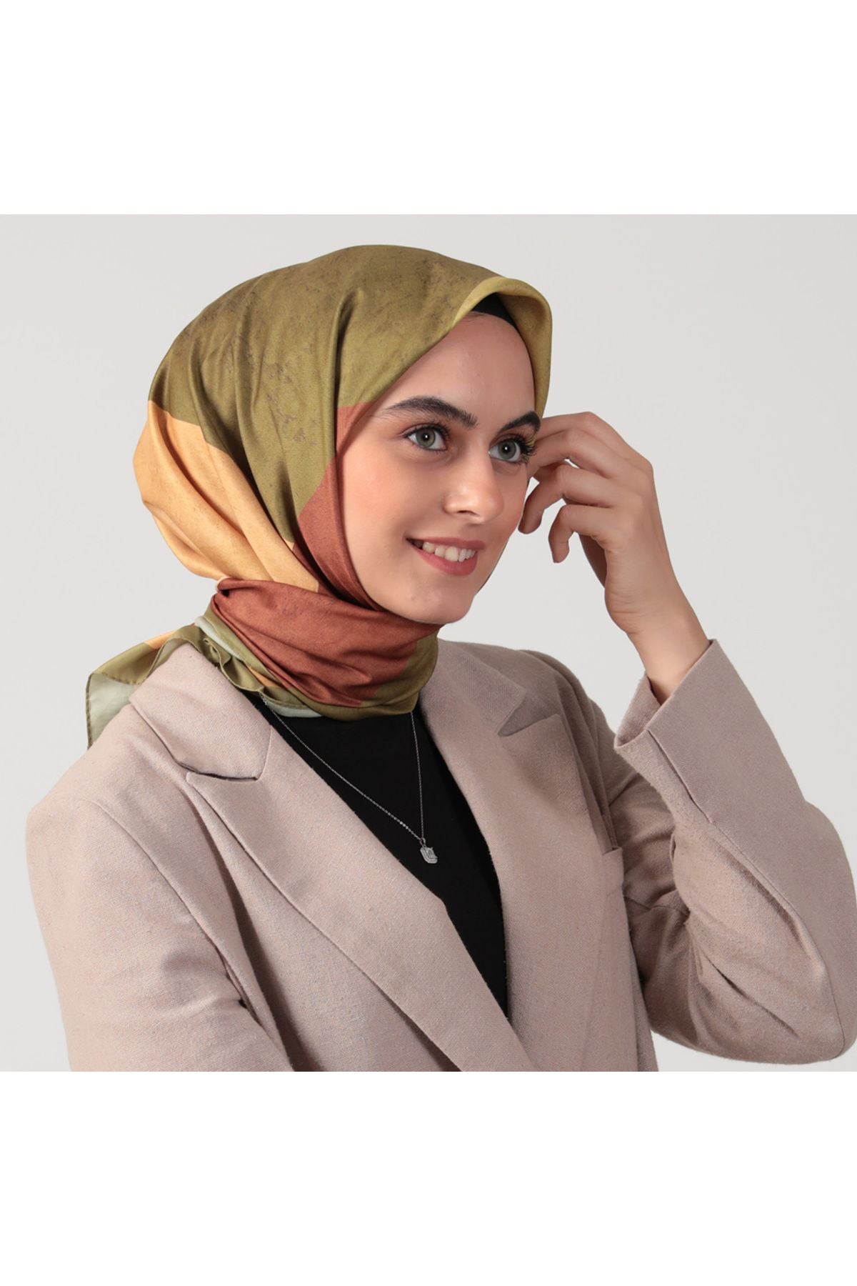 • Pamuk İpek Eşarp - Asimetrik Desen - Yağ Yeşili