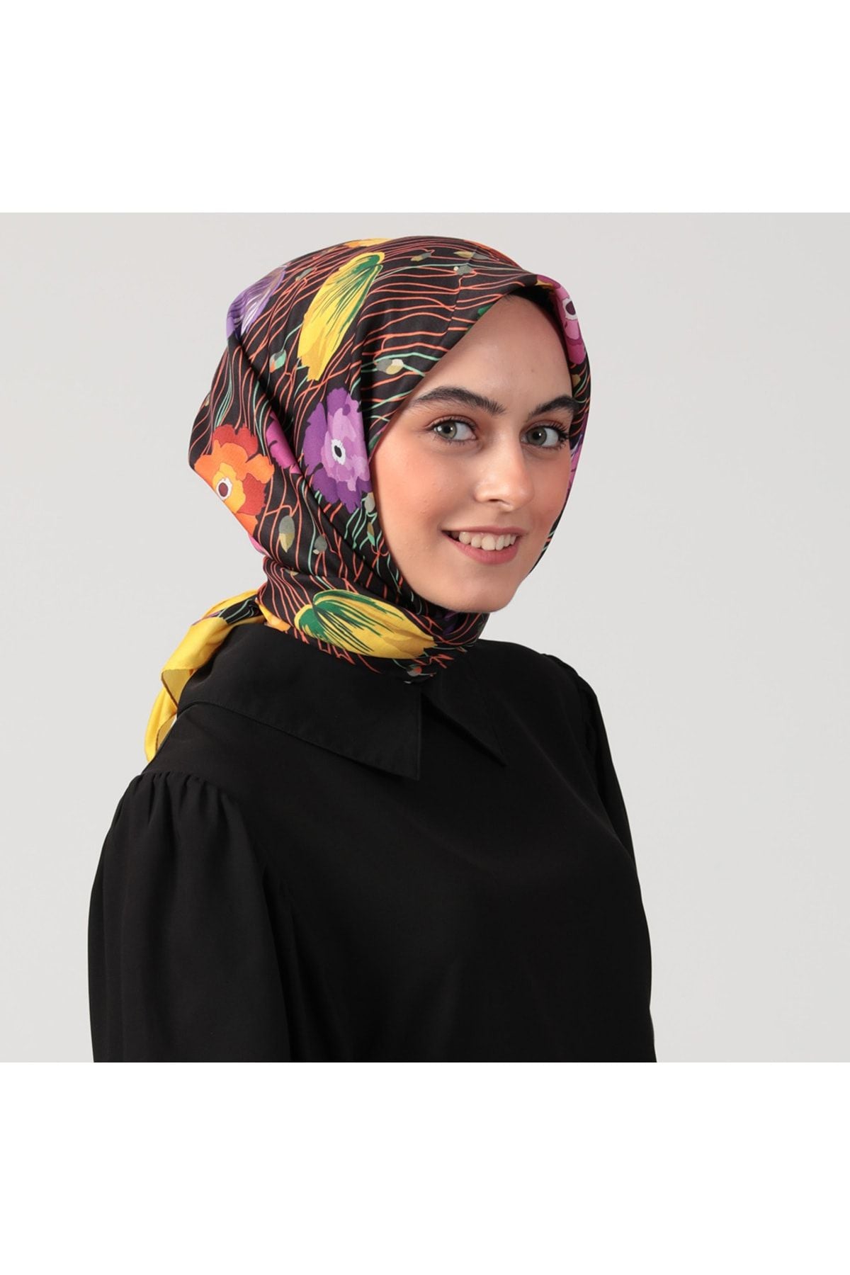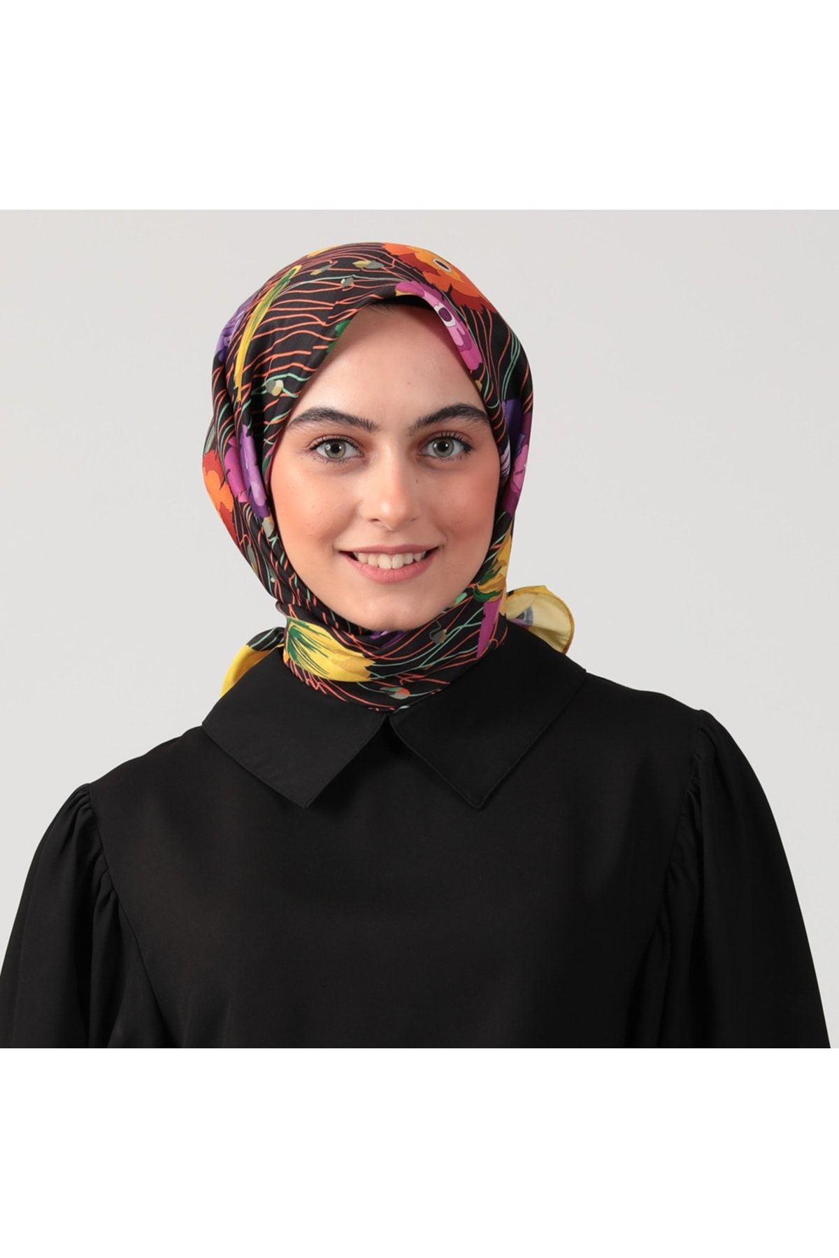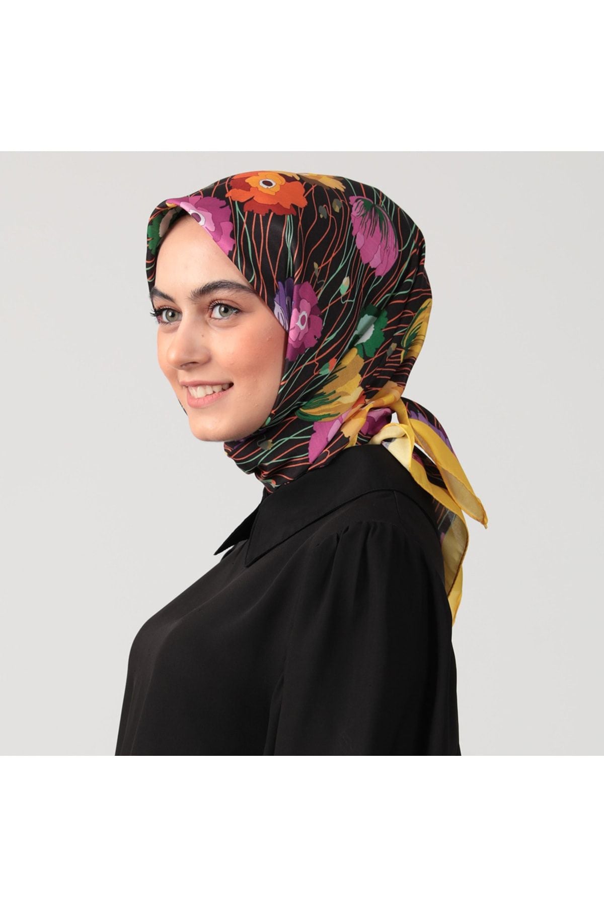 PAMUK İPEK EŞARP - BAHAR BAHÇESİ DESEN - SARI SİYAH