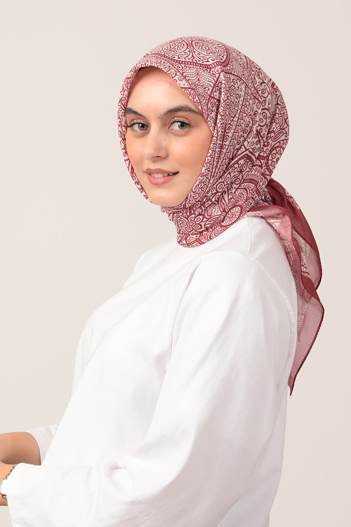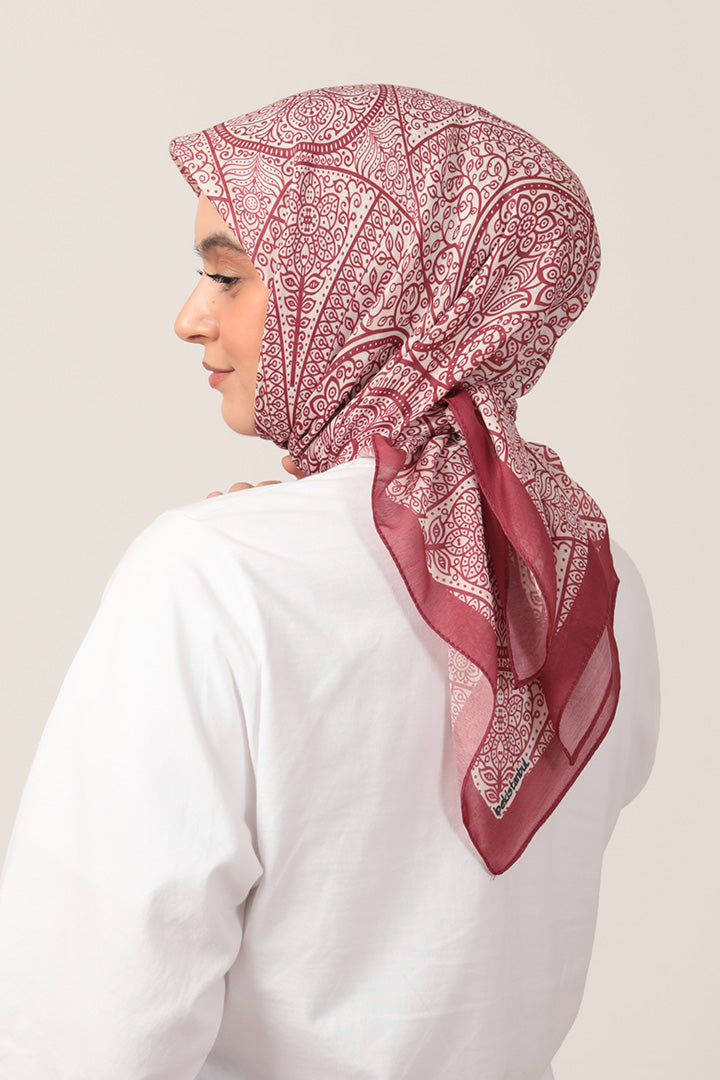Pamuk İpek Eşarp Sarmaşık Desen Bordo Ekru