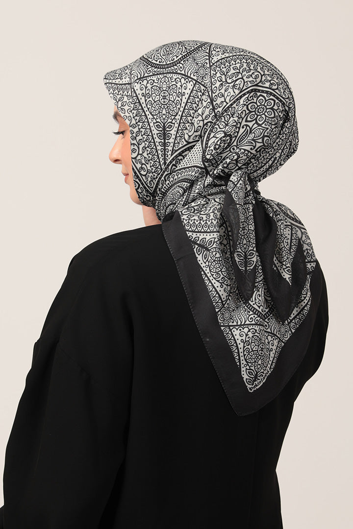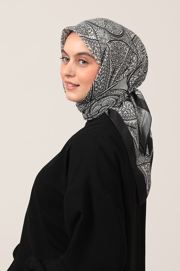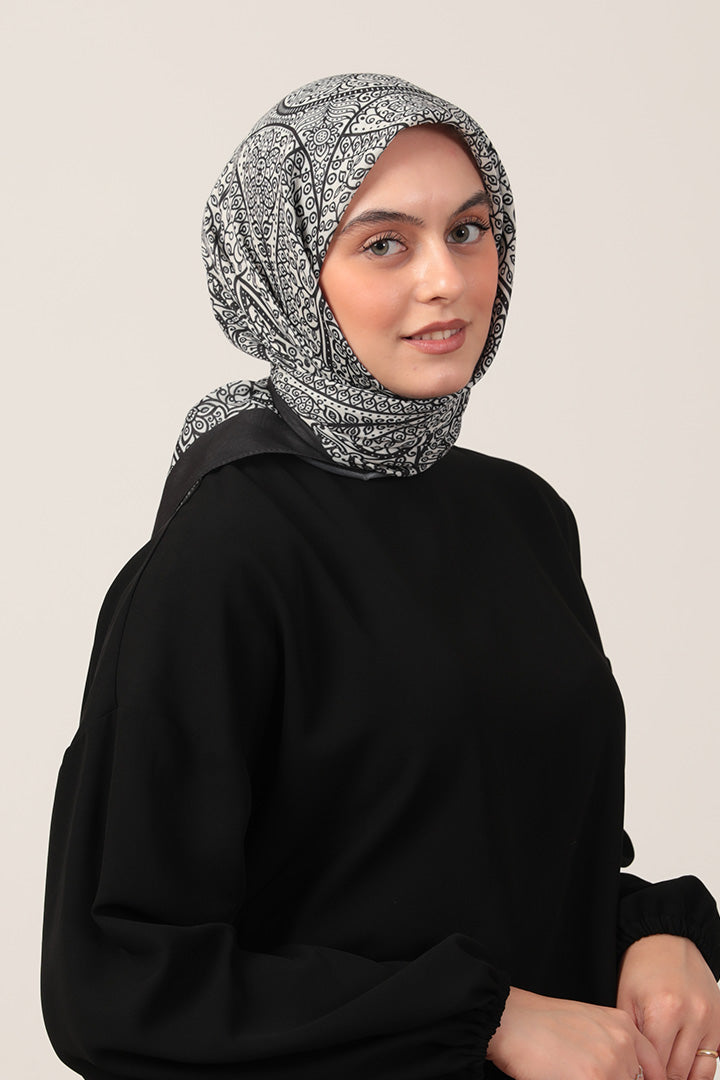 • Pamuk İpek Eşarp - Sarmaşık Desen - Siyah Beyaz