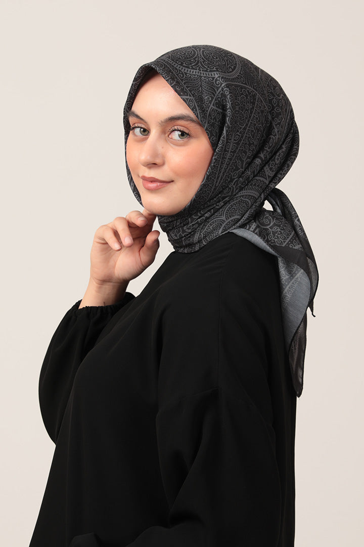 • Pamuk İpek Eşarp - Sarmaşık Desen - Siyah Füme