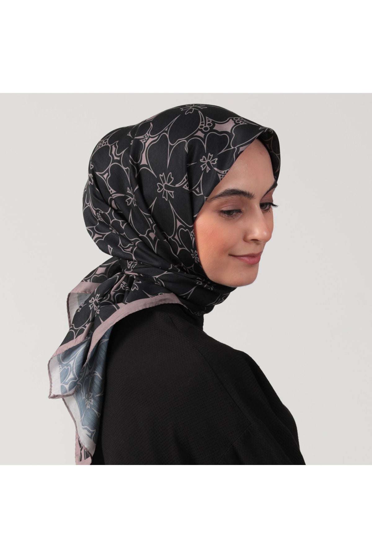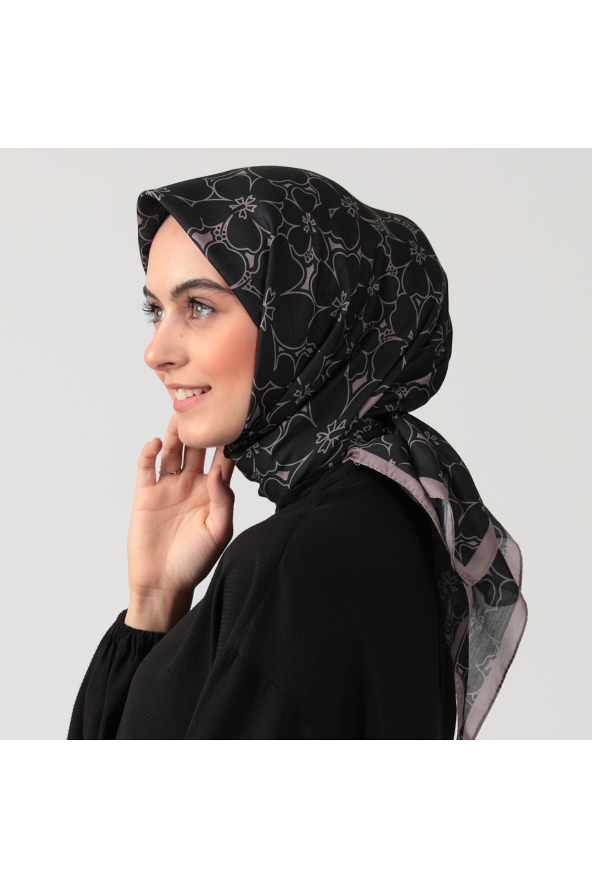 • Pamuk İpek Eşarp - Yonca Desen - Siyah Vizon