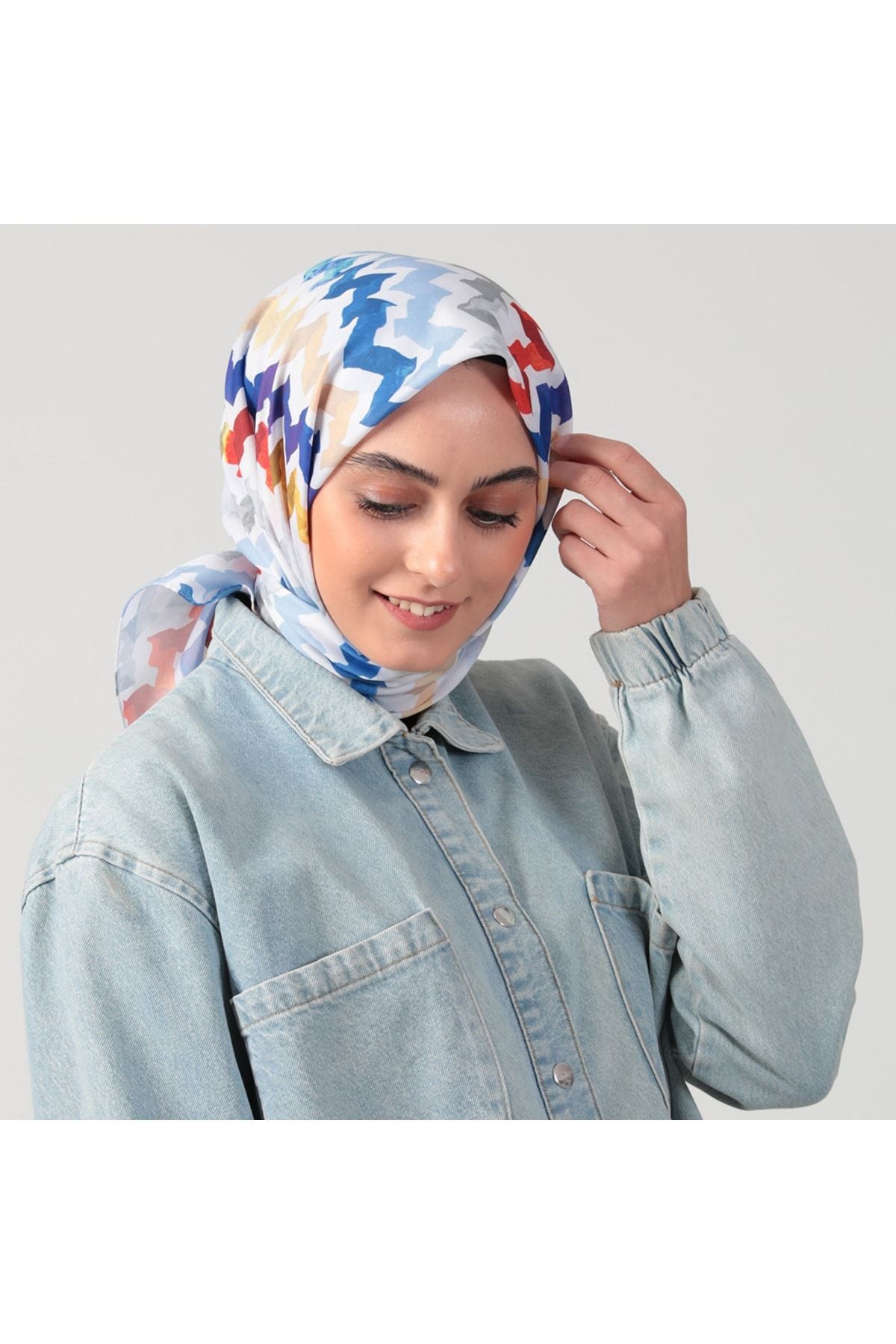 • Pamuk İpek Eşarp - Zigzag Desen - Saks