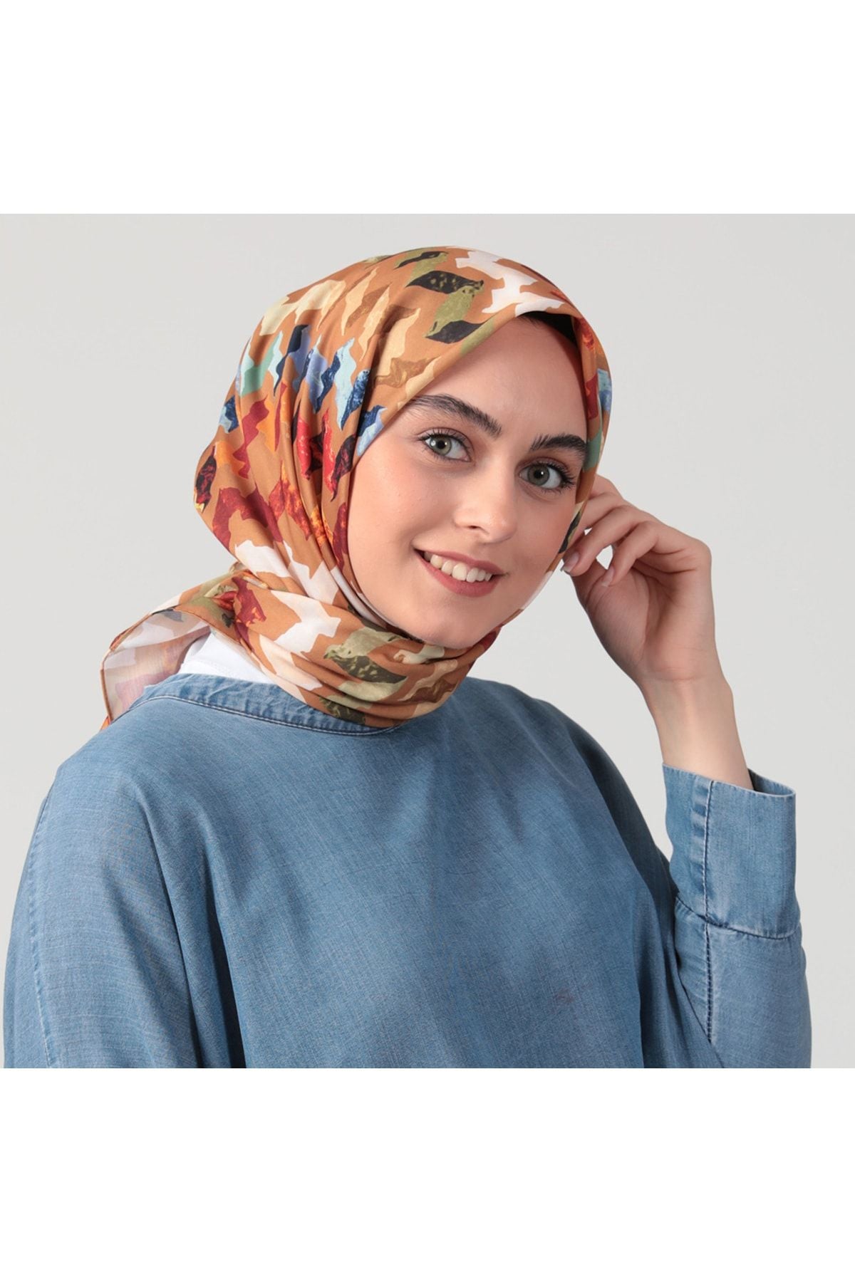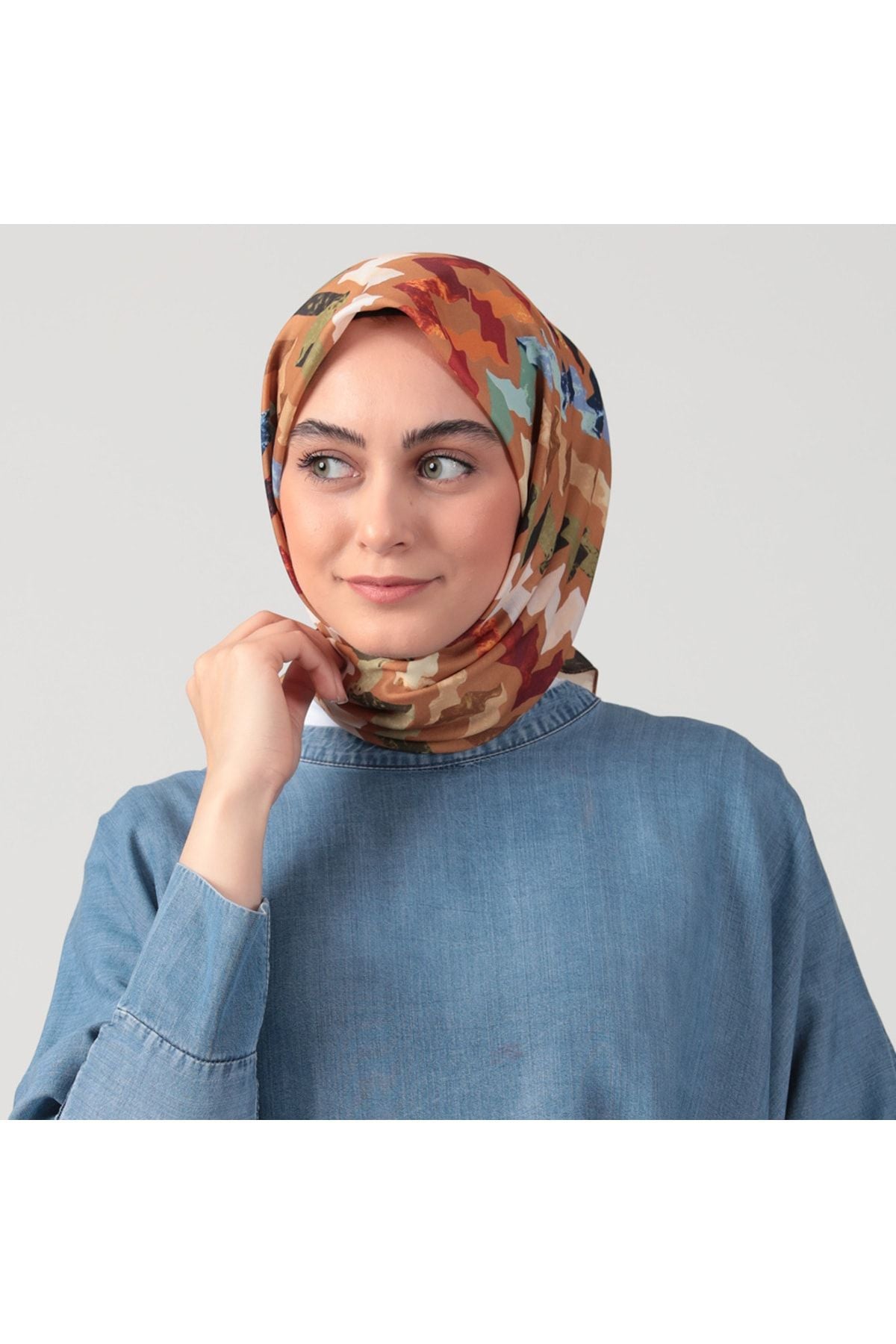 Pamuk İpek Eşarp - Zigzag Desen - Tarçın