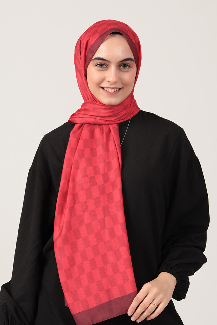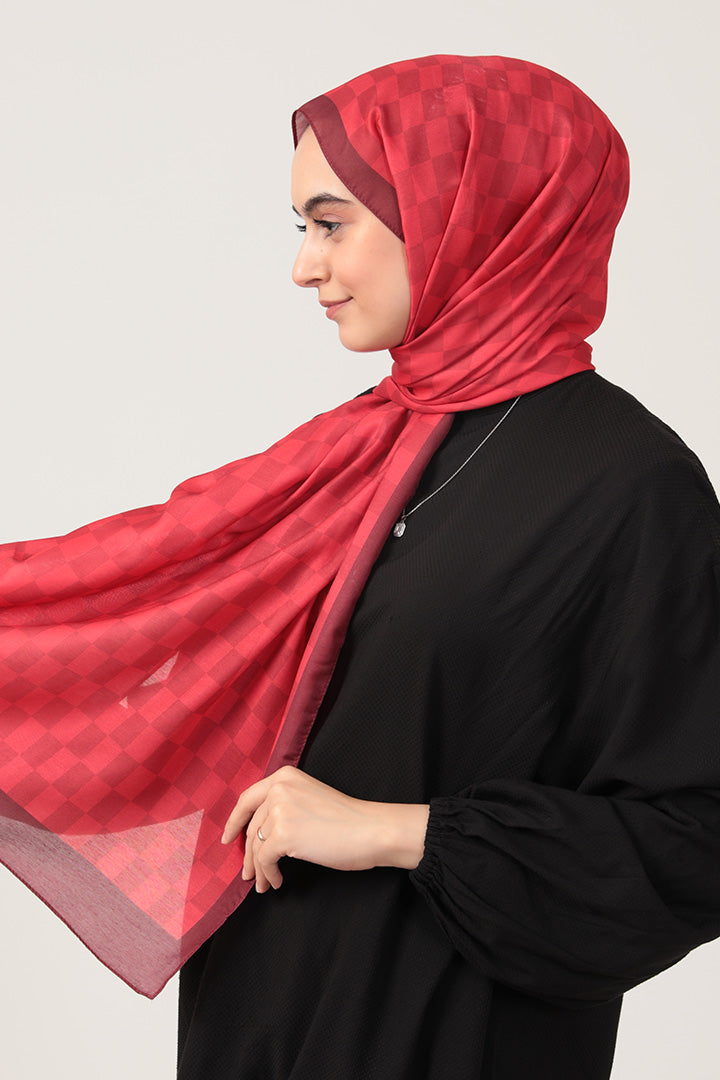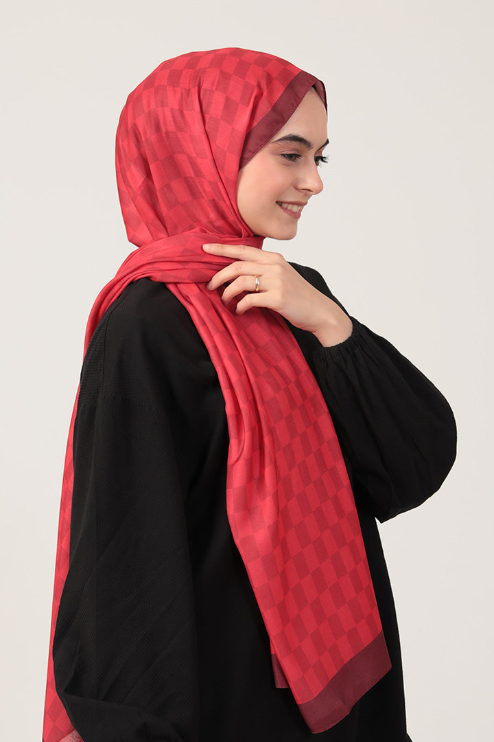 • Pamuk İpek Şal - Dama Desen - Kırmızı