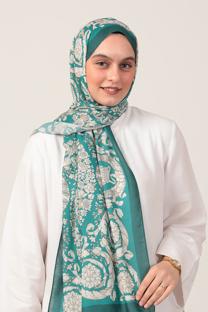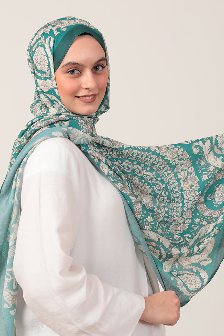 • Pamuk İpek Şal - Dönence Desen - Zümrüt Yeşili