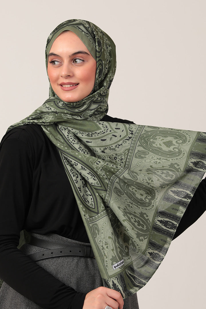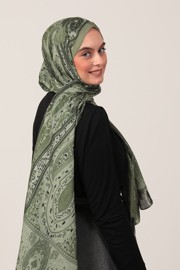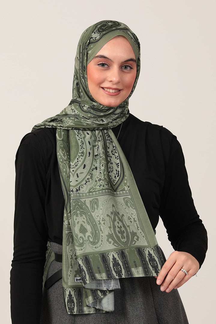 • Pamuk İpek Şal - Etnich Desen - Açık Yeşil