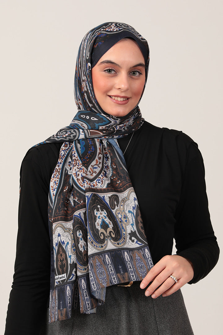 • Pamuk İpek Şal - Etnich Desen - Lacivert Camel