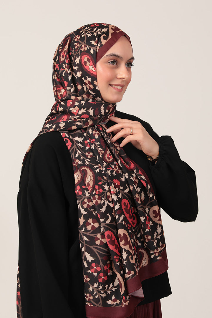 Pamuk İpek Şal - Etnik Floral Desen - Bordo Krem