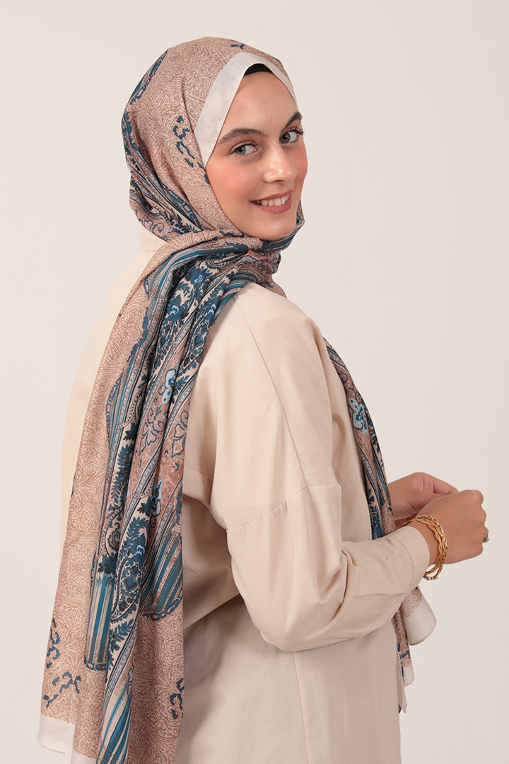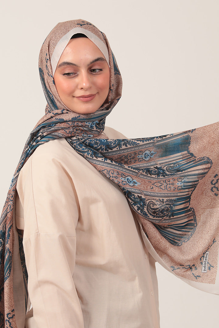 • Pamuk İpek Şal - Etro Desen - Vizon Mavi