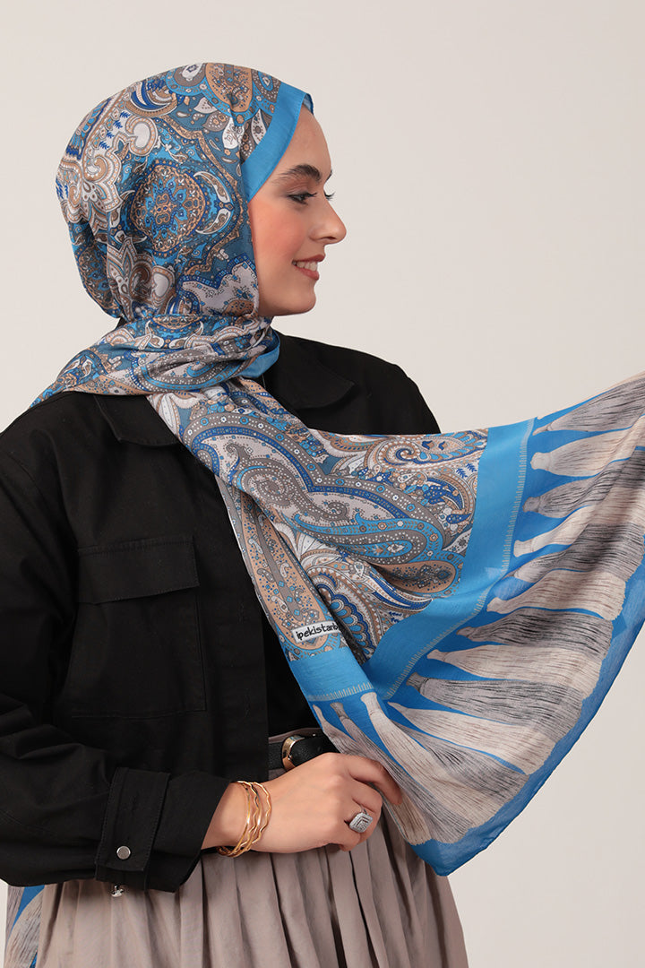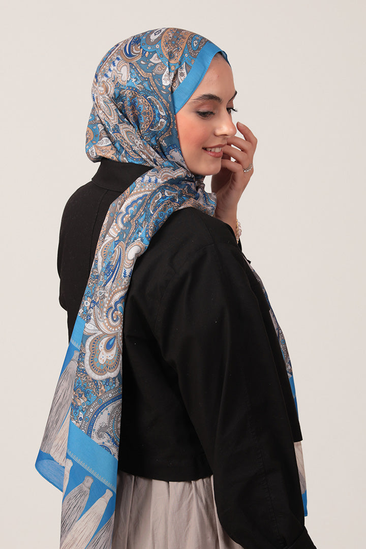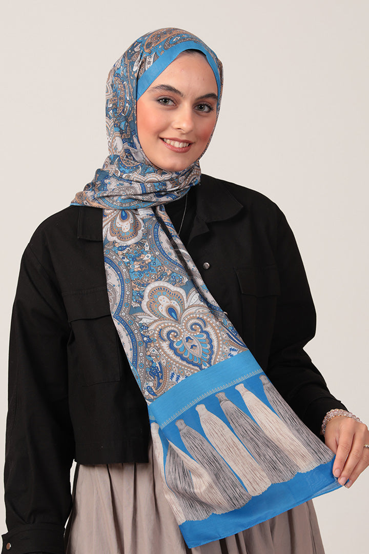 Pamuk İpek Şal Etro Püskül Desen Mavi