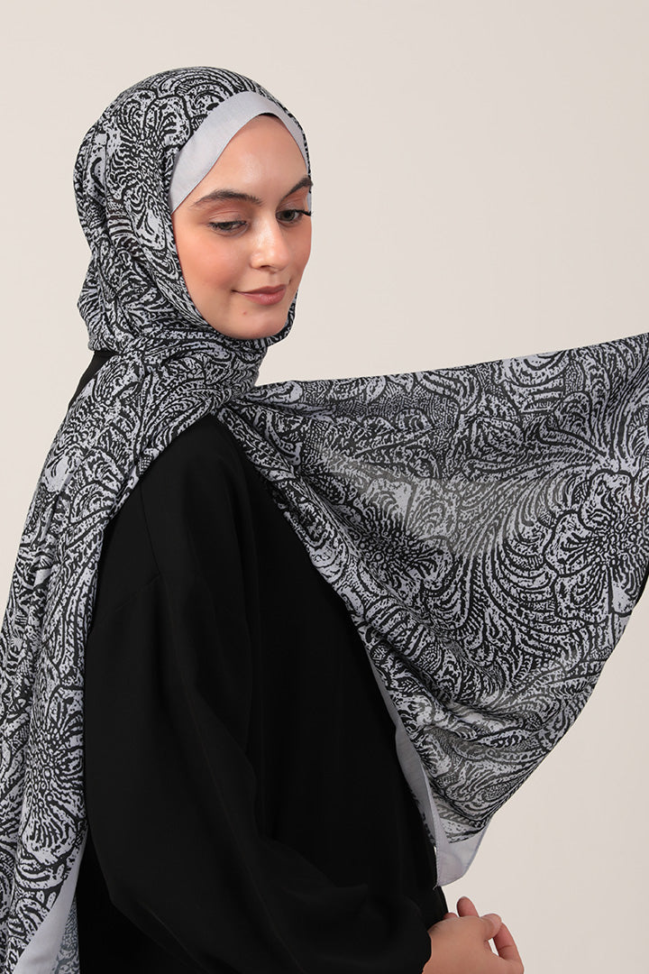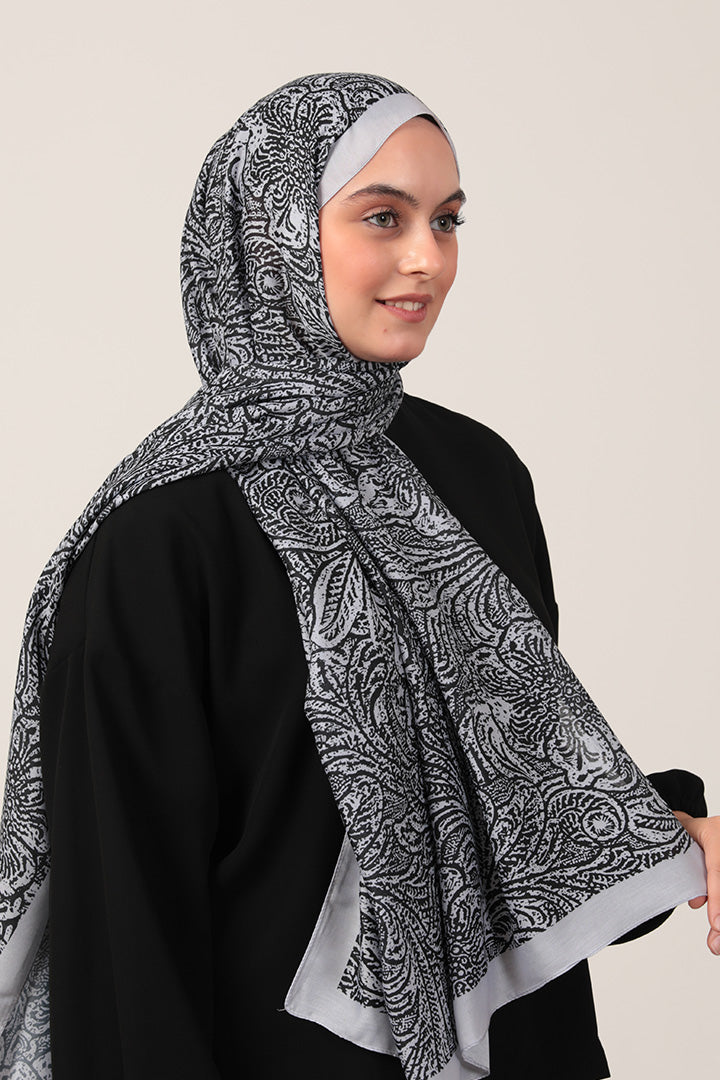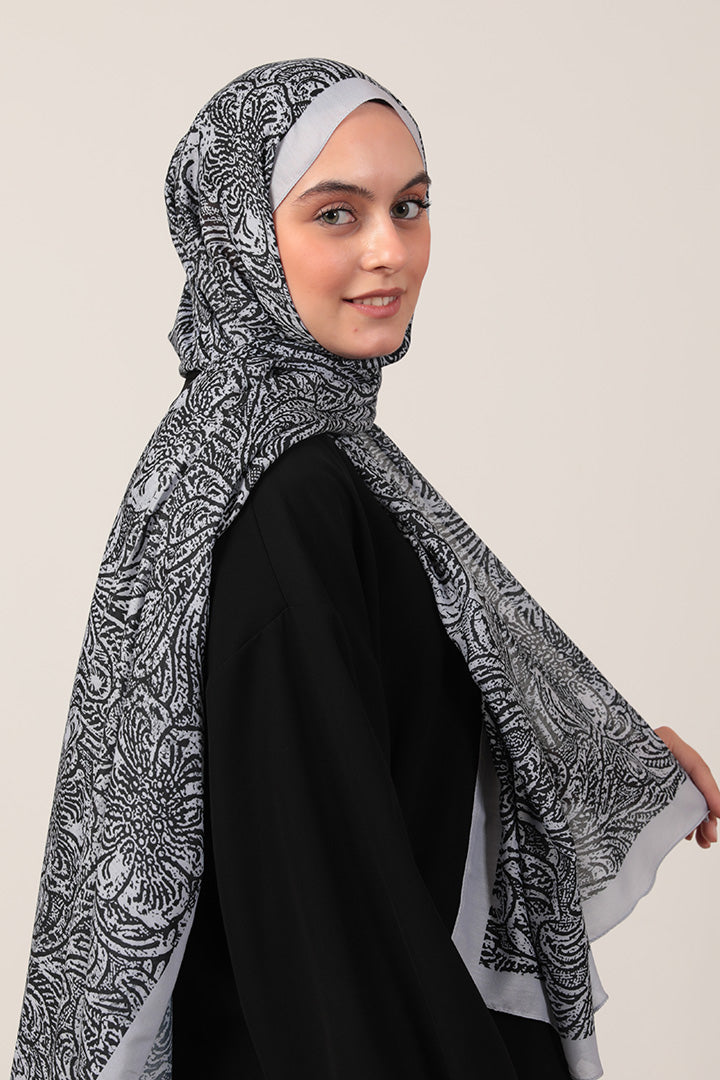 Pamuk İpek Şal Lalezar Desen Gri Siyah