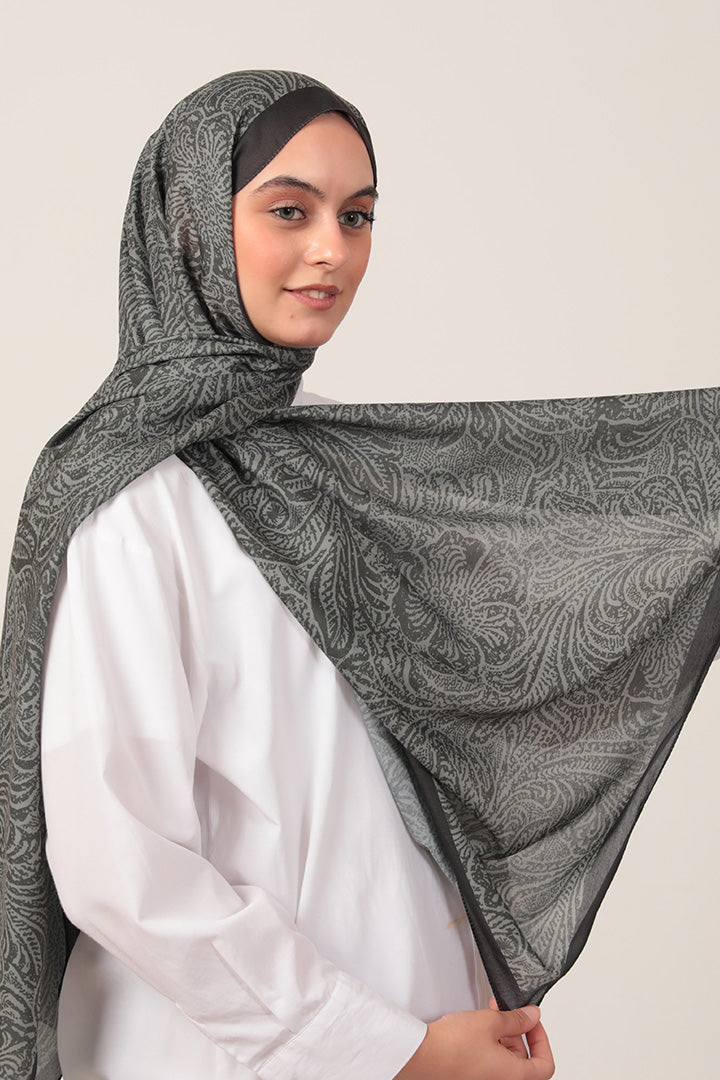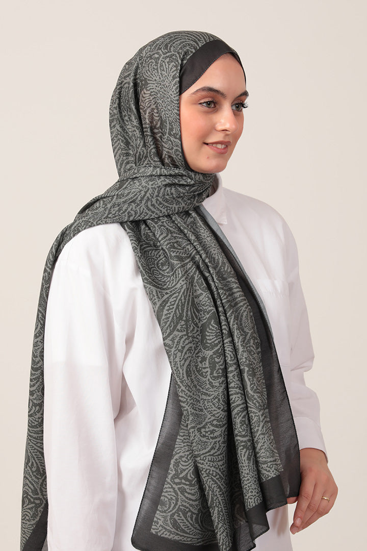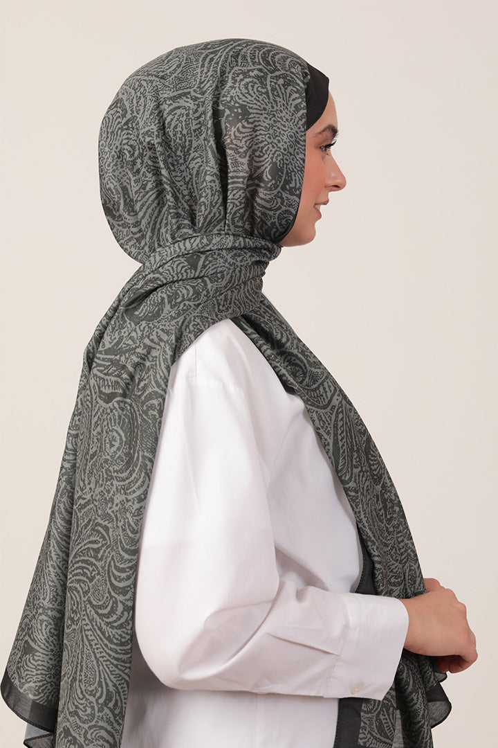 Pamuk İpek Şal - Lalezar Desen - Haki Yeşili