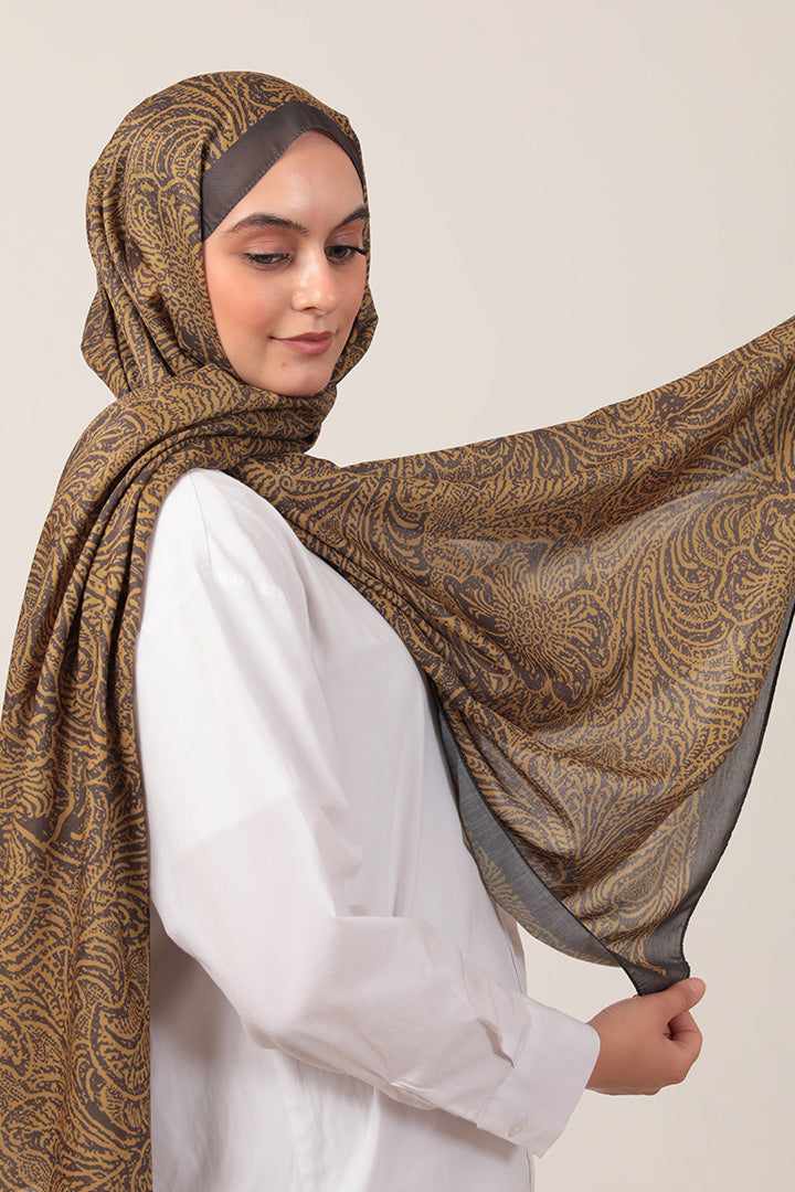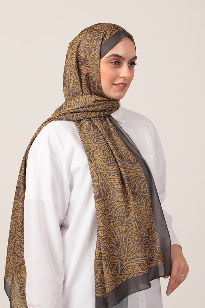 • Pamuk İpek Şal - Lalezar Desen - Hardal