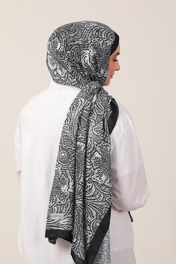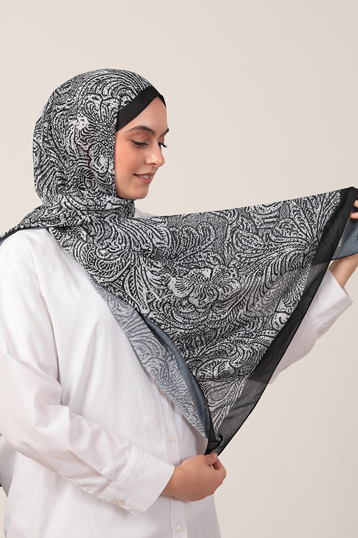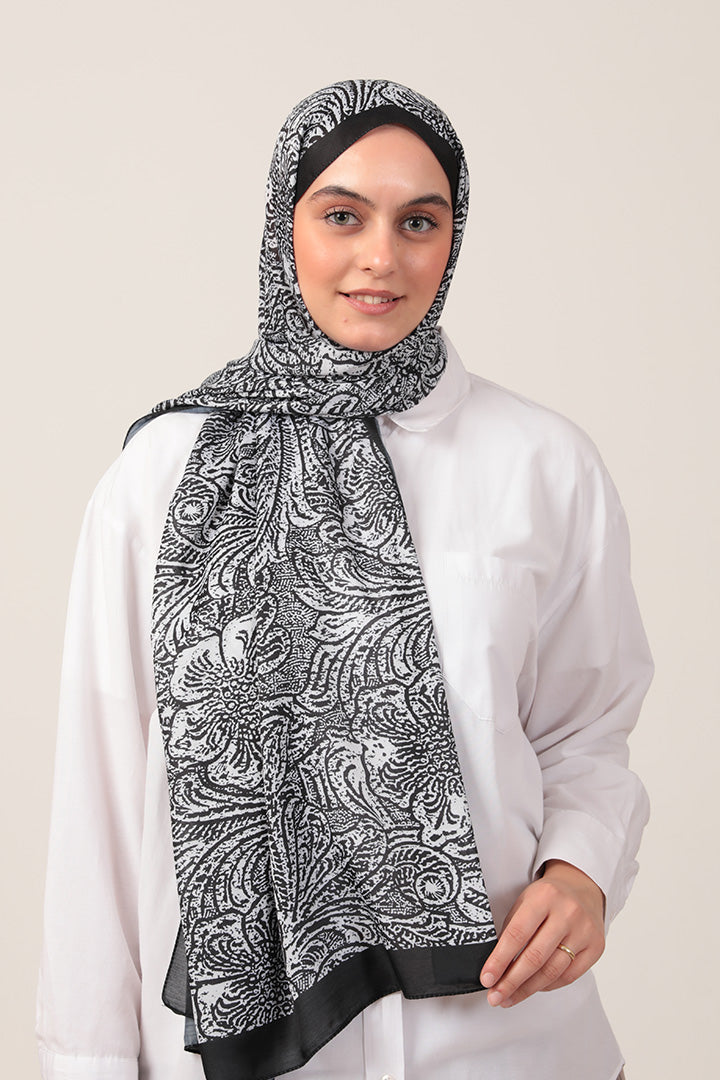 Pamuk İpek Şal Lalezar Desen Siyah Beyaz