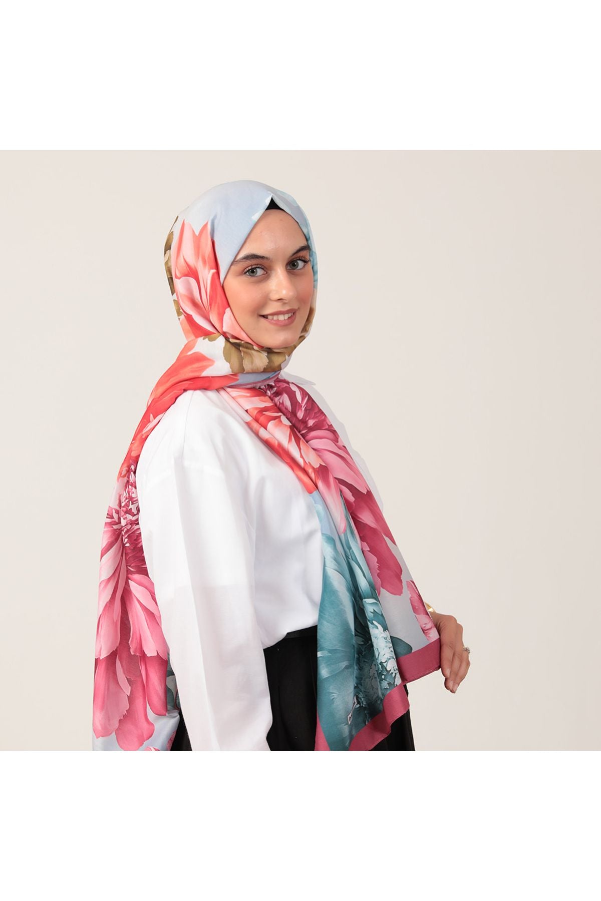 • Pamuk İpek Şal - Lotus Desen - Petrol Yeşili