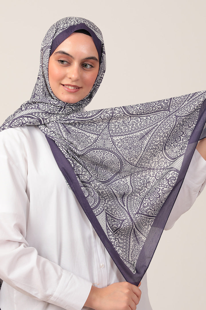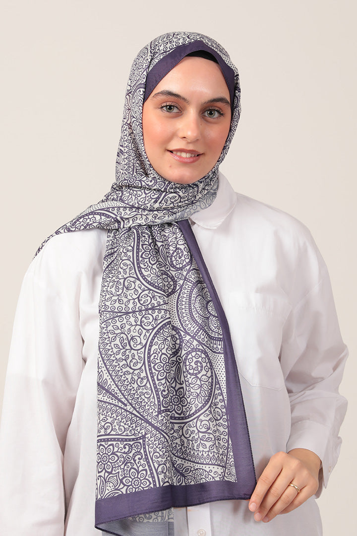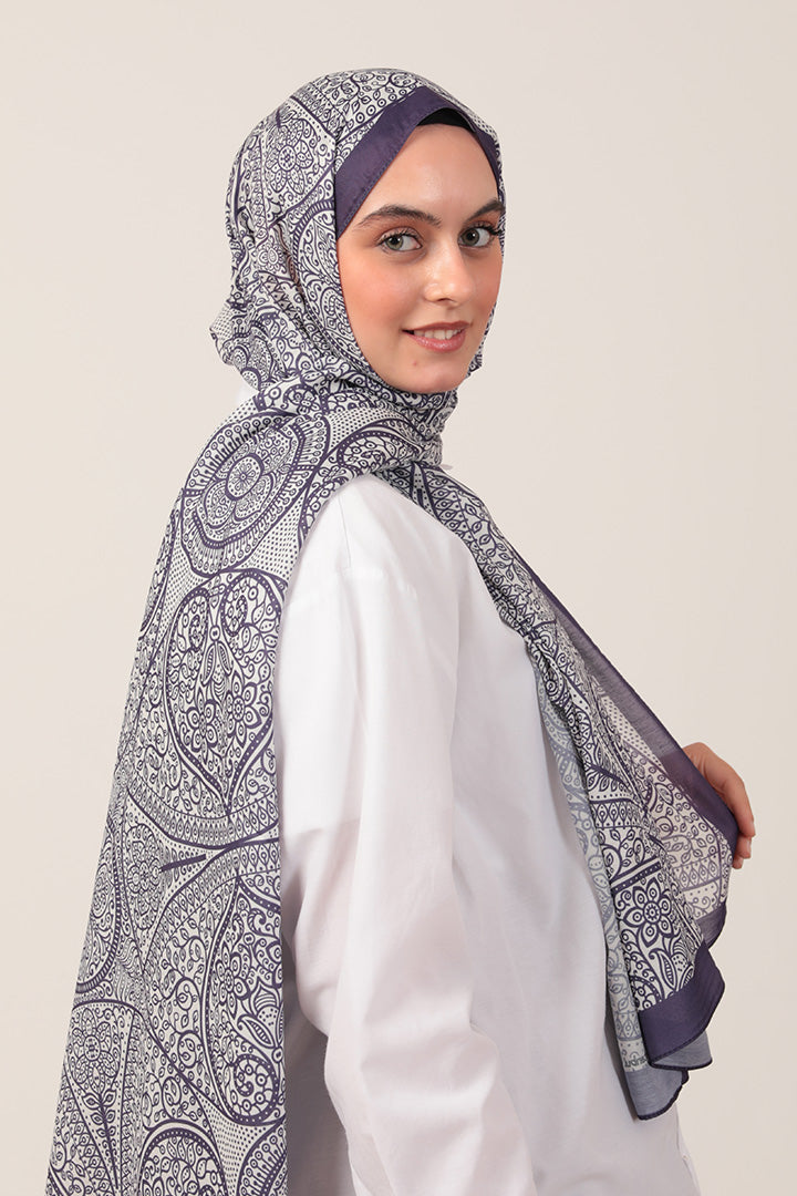 Pamuk İpek Şal Sarmaşık Desen Mor Ekru