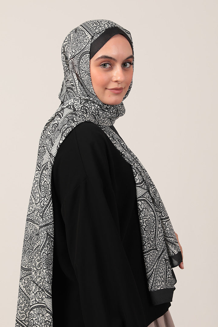 Pamuk İpek Şal Sarmaşık Desen Siyah Beyaz