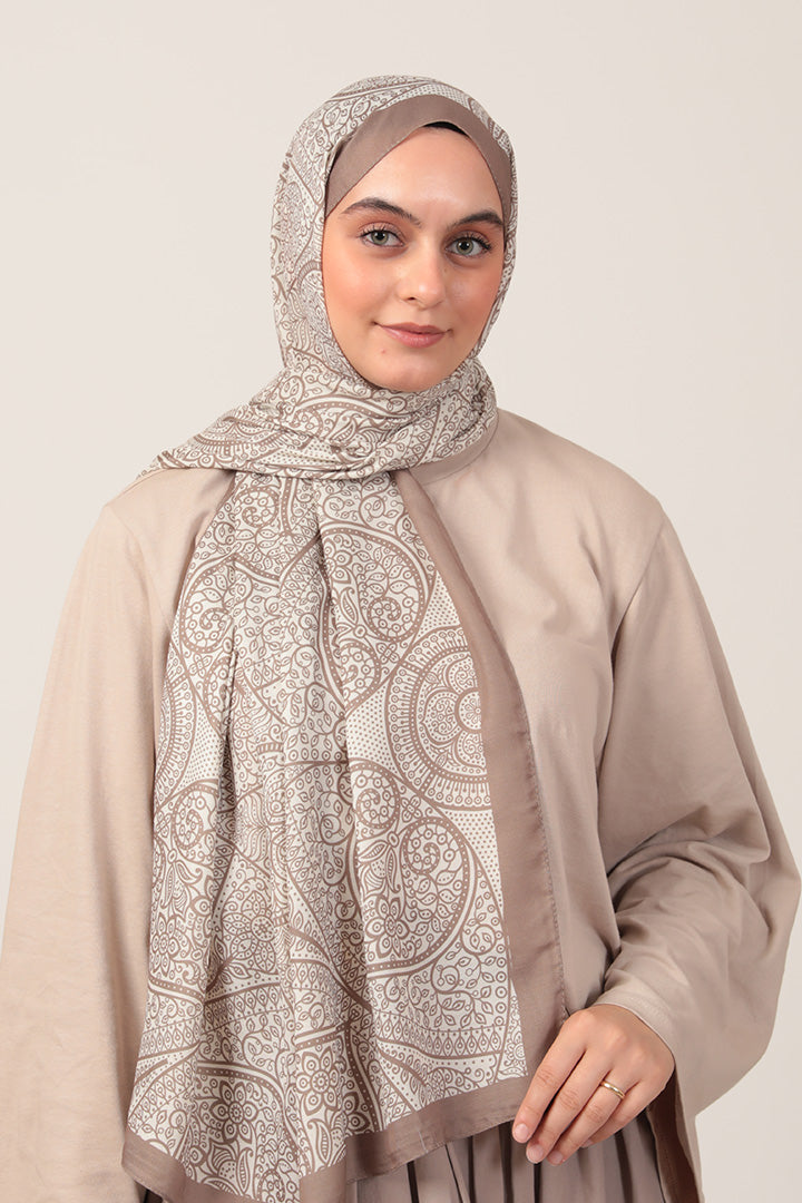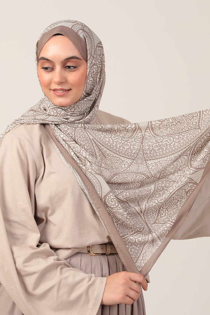 Pamuk İpek Şal Sarmaşık Desen Vizon Ekru