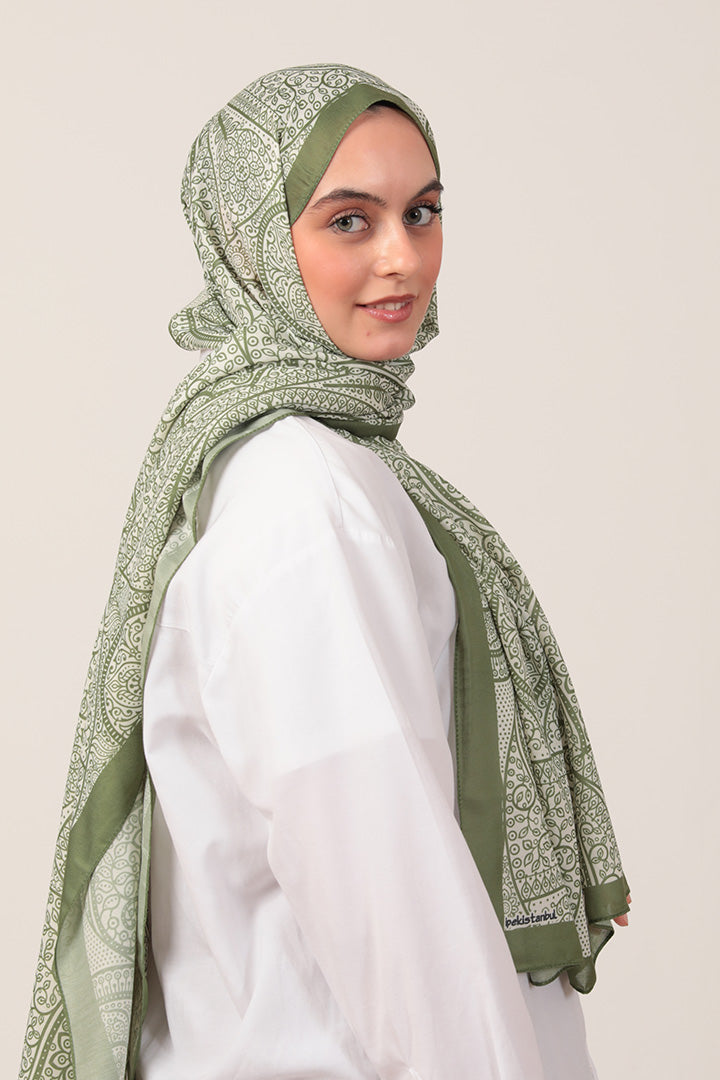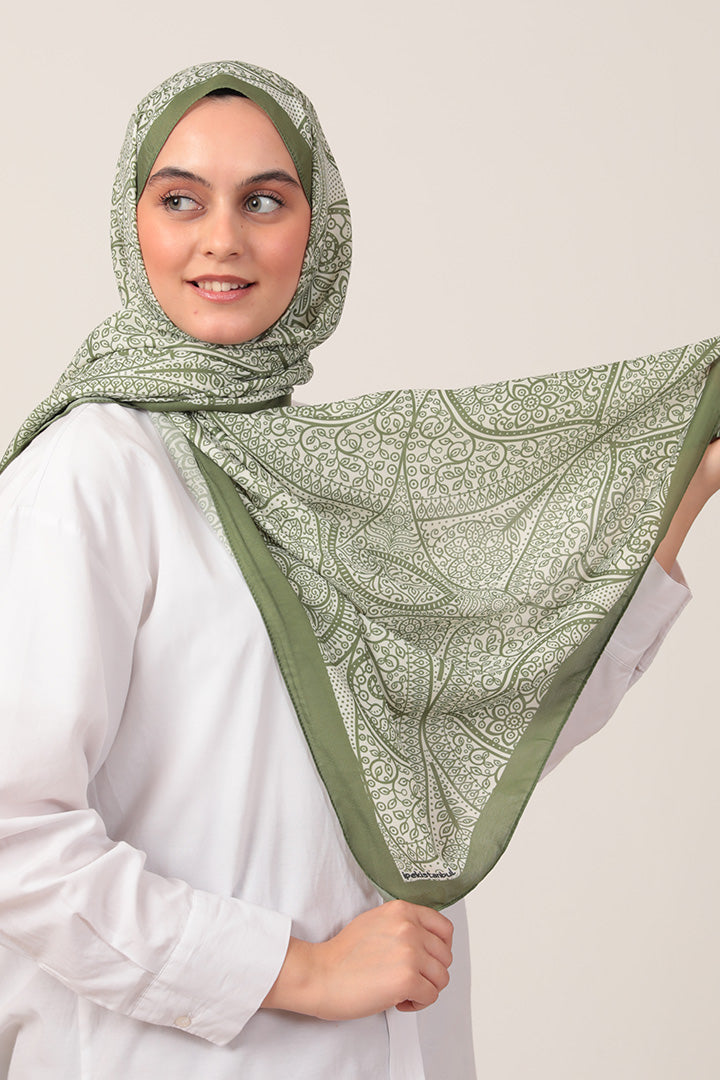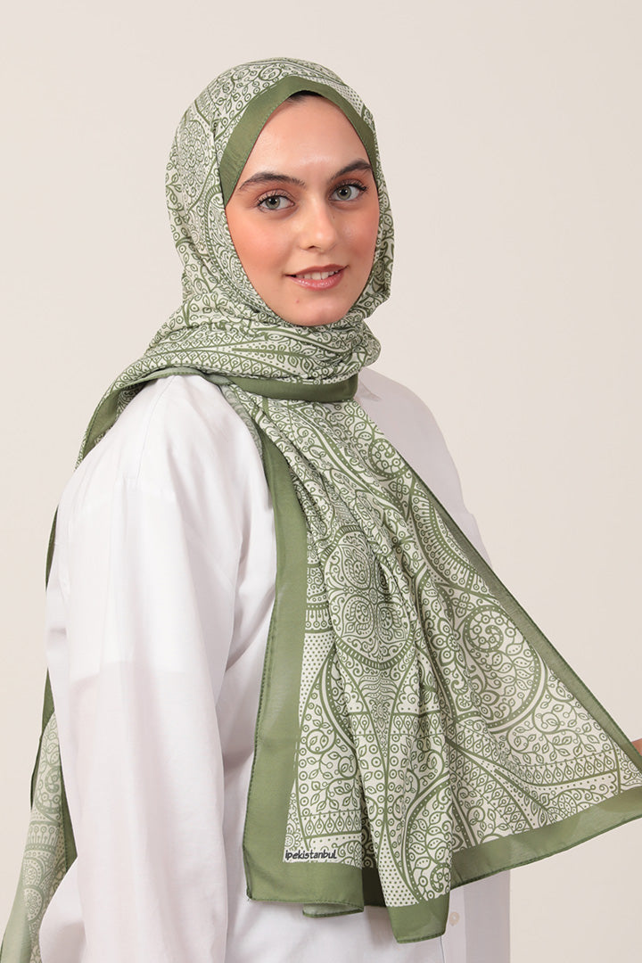 Pamuk İpek Şal Sarmaşık Desen Yeşil Ekru