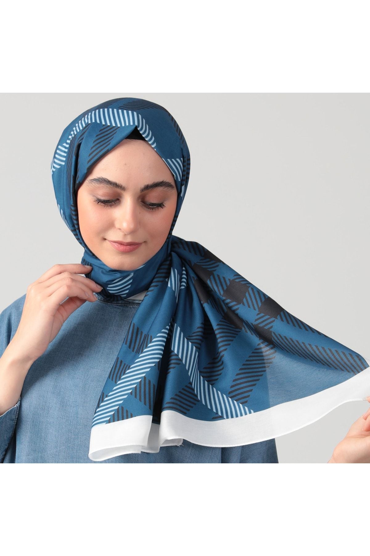 • Pamuk Ipek Şal - Ekose Desen - Lacivert