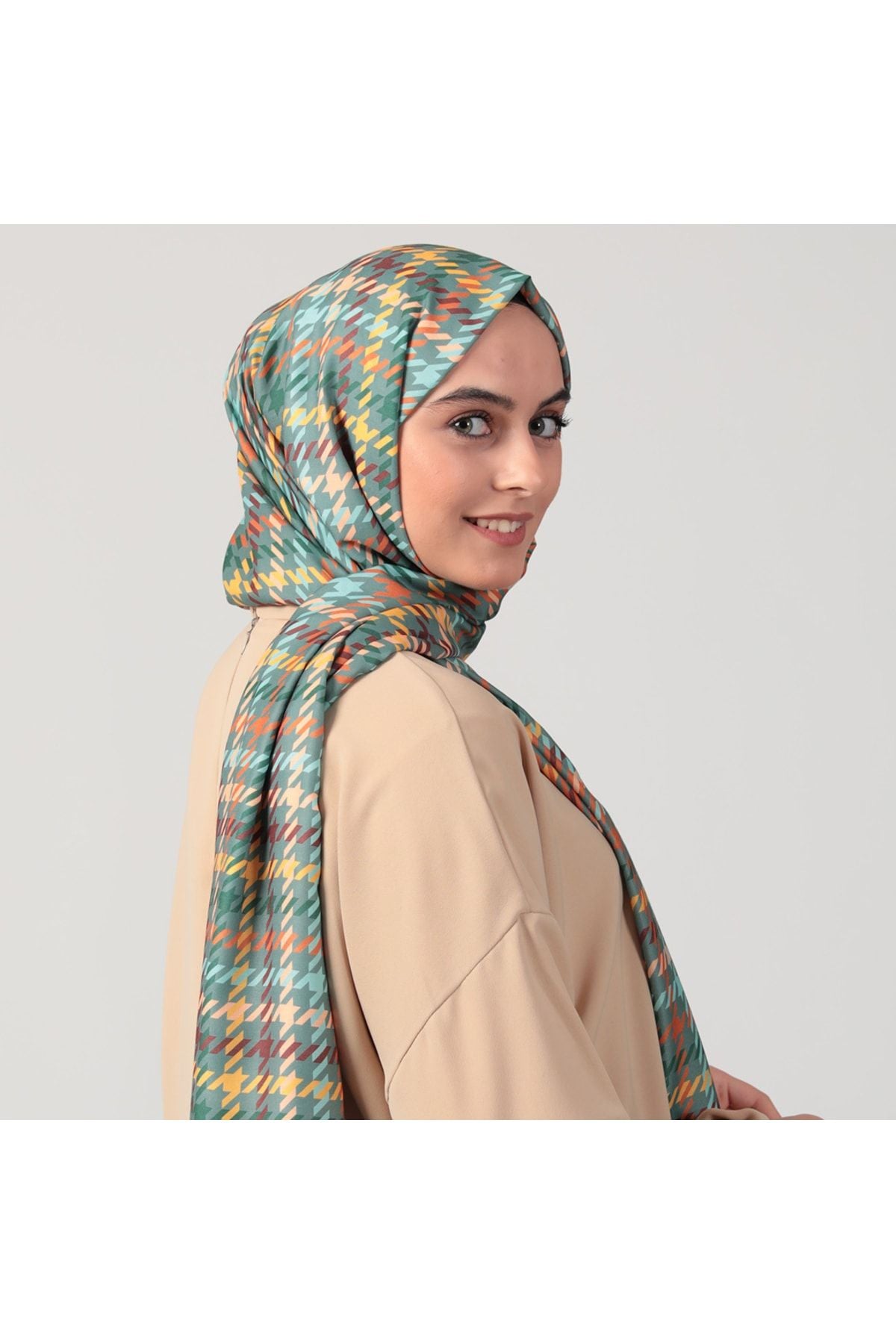 • Pamuk Ipek Şal - Kazayağı Desen - Haki Yeşili