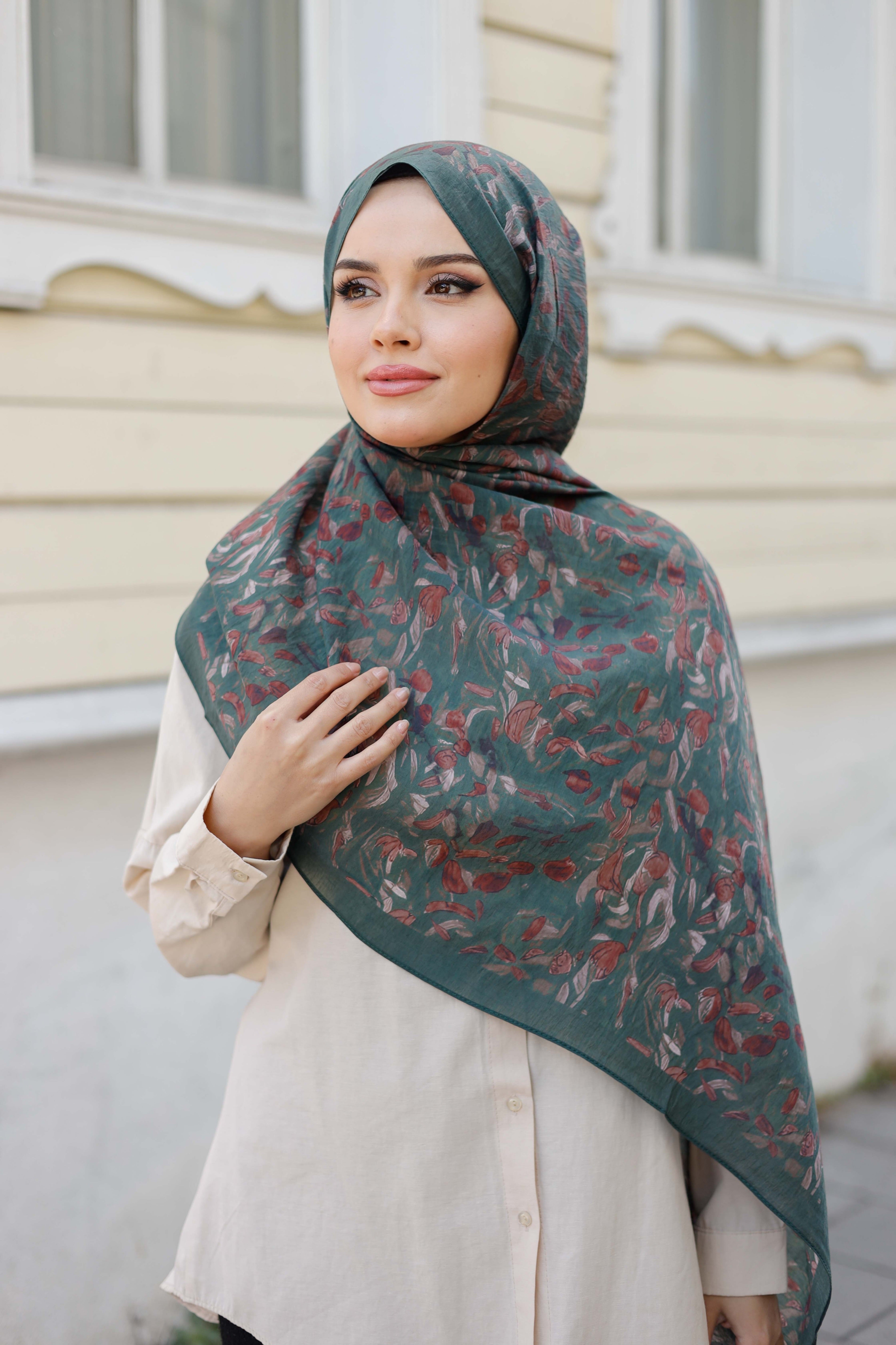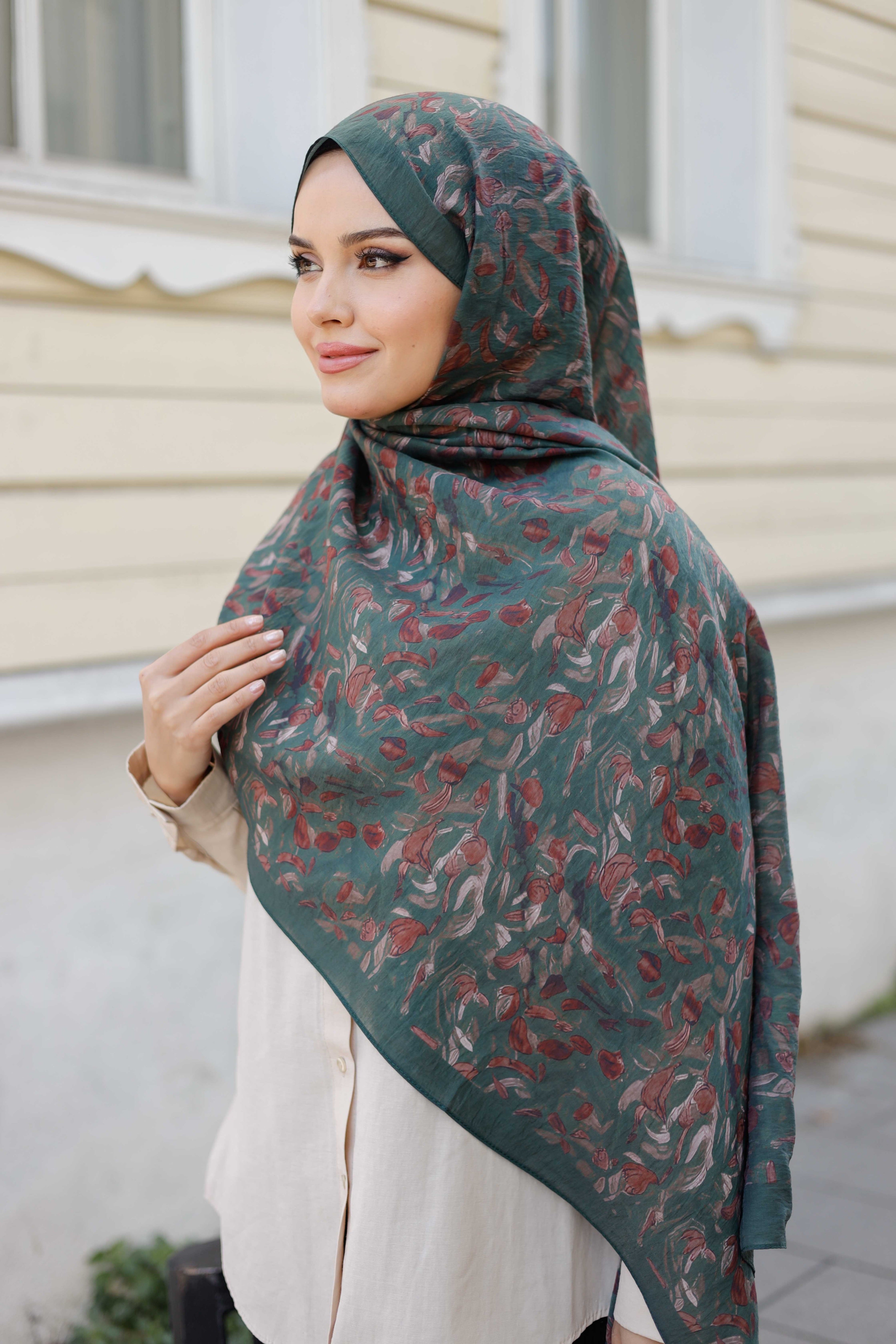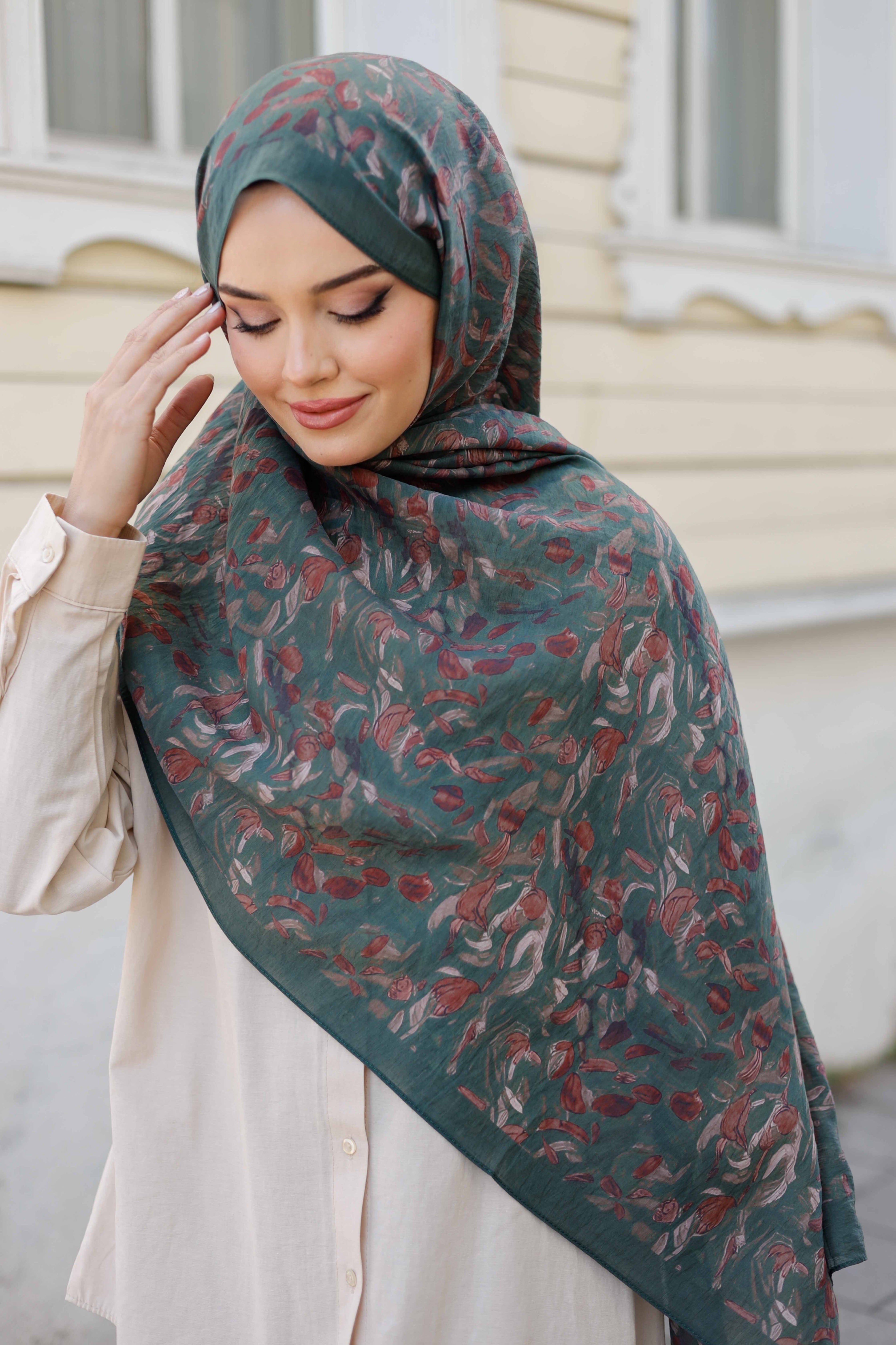 Yaprak Desen Tensel Şal Petrol Yeşili
